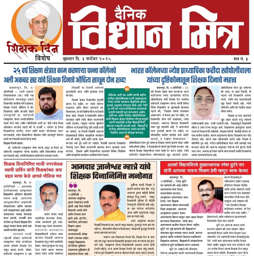 बदलापूर , दिनांक : २ / प्रतिनिधी :- अली अकबर मियागामवाला (सर )यांनी पन्ना कोलेजच्या माध्यामातून हजारो विद्यार्थ्यांना प्रगतीचा मार्ग दाखवला, शिक्षण दिनाचे आचीत्या हे थोर शिक्षणतज्ञ आणि भारताचे पहिले उपराष्ट्रपती डॉ. सर्वपल्ली राधाकृष्णन यांच्या जन्मदिनानिमित्त साजरे केले जाते, आणि त्यानिमित्ताने अली सर यांनी त्यांना विनम्र अभिवादन करताना म्हटले कि जे दरवर्षी ५ सप्टेंबर हा दिवस शिक्षकांच्या समर्पण , संयम आणि कठोर परिश्रमाच्या आदर करण्यासाठी, तसेच विद्यार्थ्यांना जीवनात त्यांचे महत्त्वपूर्ण योगदान साजरे करण्यासाठी साजरा केला जातो. शिक्षण दिनाचे महत्त्व: डॉ. सर्वपल्ली राधाकृष्णन यांचा वारसा असून हा दिवस डॉ. सर्वपल्ली राधाकृष्णन यांच्या कार्याचा आणि शिकवणीचा सन्मान करण्यासाठी आहे, ज्यांनी शिक्षणाला सर्वात श्रेष्ठ व्यवसाय मानले.