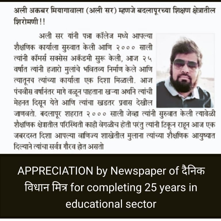 अली सर यांनी पन्ना कॉलेजमध्ये आपल्या शैक्षणिक कार्याला सुरुवात केली आणि २००० साली त्यांनी कॉमर्स सक्सेस अकॅडेमी सुरु केली, आज २५ वर्षात त्यांनी हजारो मुलांचे भवितव्य निर्माण केले आणि त्यातूनच त्यांच्या कार्याला एक दिशा मिळाली. आज पंचवीस वर्षानंतर मागे वळून पाहताना कार्या अर्थाने त्यांची मेहनत दिसून येते आणि त्यांचा खडतर प्रवास देखील जाणवतो...बदलापूर शहरात २००० साली जेव्हा त्यांनी सुरुवात केली त्यावेळी शैक्षणिक क्षेत्रातील परिस्थिती काही वेगळीच होती परंतु त्यांनी टिकून राहून आज एक जबरदस्त दिशा आपल्या वाणिज्य शाखेतील मुलांना त्यांच्या शैक्षणिक आयुष्यात दिल्याने त्यांचा सर्वत्र गौरव होत असतो .