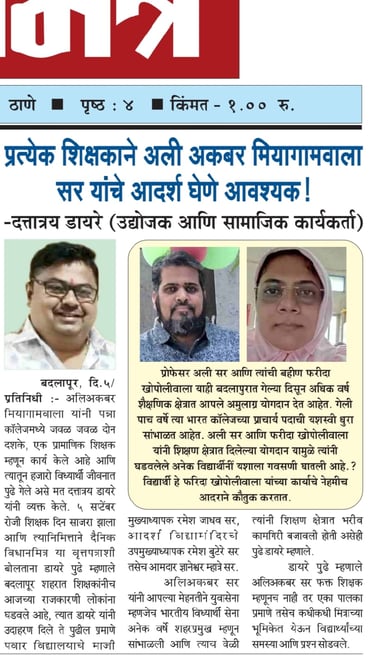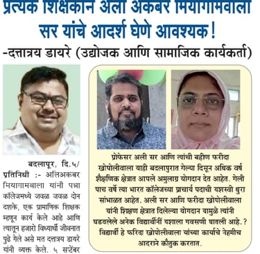 दैनिक विधानमित्र - Thane पृष्ठ : ४ प्रत्येक शिक्षकाने अली अकबर मियागामवाला सर यांचे आदर्श घेणे आवश्यक ! - दत्तात्रय डायरे (उद्योजक आणि सामाजिक कार्यकर्ता) बदलापूर, दि. ५/ प्रतिनिधी :- अलिअकबर मियागामवाला यांनी पन्ना कॉलेजमध्ये जवळ जवळ दोन दशके, एक प्रामाणिक शिक्षक म्हणून कार्य केले आहे आणि त्यातून हजारो विध्यार्थी जीवनात पुढे गेले असे मत दत्तात्रय डायरे यांनी व्यक्त केले. ५ सप्टेंबर रोजी शिक्षक दिन साजरा झालाआणि त्यानिमित्ताने दैनिक विधानमित्र या वृत्तपत्राशी बोलताना डायरे पुढे म्हणाले बदलापूर शहरात शिक्षकांनीच आजच्या राजकारणी लोकांना घडवले आहे, त्यात डायरे यांनी उदाहरण दिले ते पुढील प्रमाणे पवार विद्यालयाचे माजी प्रोफेसर अली सर आणि त्यांची बहीण फरीदा खोपोलीवाला याही बदलापुरात गेल्या दिसून अधिक वर्ष शैक्षणिक क्षेत्रात आपले अमुलाग्र योगदान देत आहेत. गेली पाच वर्षे त्या भारत कॉलेजच्या प्राचार्य पदाची यशस्वी धुरा सांभाळत आहेत. अली सर आणि फरीदा खोपोलीवाला यांनी शिक्षण क्षेत्रात दिलेल्या योगदान यामुळे त्यांनी घडवलेले अनेक विद्यार्थीनीं यशाला गवसणी घातली आहे. ? विद्यार्थी हे फरिदा खोपोलीवाला यांच्या कार्याचे नेहमीच आदराने कौतुक करतात. मुख्याध्यापक रमेश जाधव सर, आदर्श विद्यामंदिरचे उपमुख्याध्यापक रमेश बुटेरे सर तसेच आमदार ज्ञानेश्वर म्हात्रे सर. अलिअकबर सर यांनी आपल्या मेहनतीने युवासेना म्हणजेच भारतीय विध्यार्थी सेना अनेक वर्षे शहरप्रमुख म्हणून सांभाळली आणि त्याच वेळी त्यांनी शिक्षण क्षेत्रात भरीव कामगिरी बजावली होती असेही पुढे डायरे म्हणाले. डायरे पुढे म्हणाले अलिअकबर सर फक्त शिक्षक म्हणूनच नाही तर एका पालका प्रमाणे तसेच कधीकधी मित्राच्या भूमिकेत येऊन विद्यार्थ्यांच्या समस्या आणि प्रश्न सोडवले.